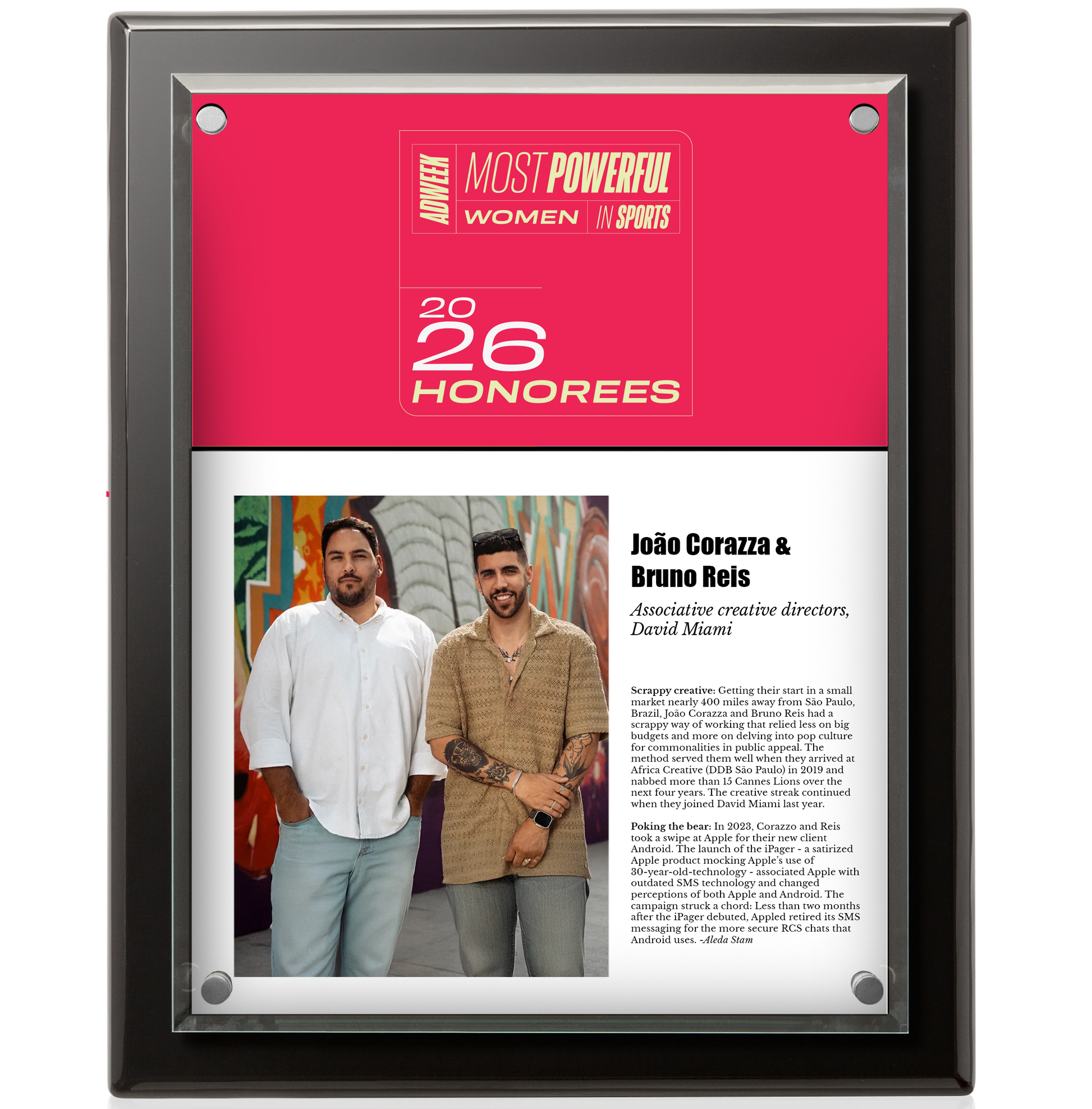 Celebrate your recognition with this exclusive Adweek award, featuring a sleek, black-framed display. Our premium customizable option, this high-gloss plaque shows off your feature in Adweek behind a Starfire Crystal glass plane.